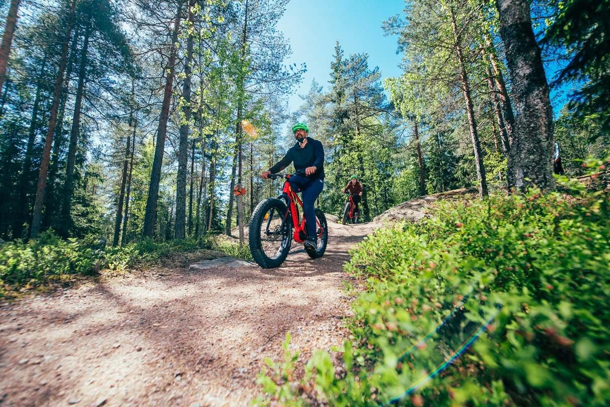 E-fatbike eli sähköavusteinen läskipyörä kulkee vakaasti niin hiekkateillä kuin metsäpoluillakin leveiden renkaidensa ansiosta.